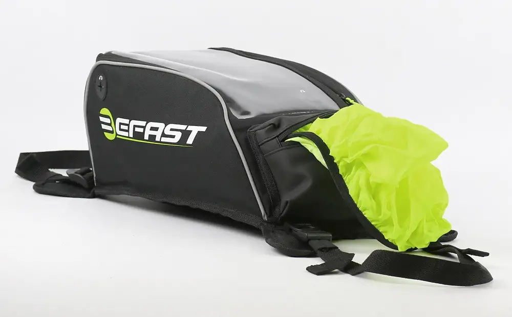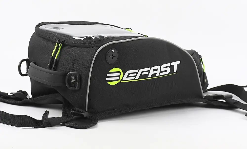 Borsa serbatoio universale, può essere montata su tutte le tipologie di moto, grazie al sistema di fissaggio con pratiche cinghie regolabili, e con magneti (inclusi). Sicura e capiente la borsa serbatoio di Befast ha un volume di 10lt ed è realizzata con materiali e finiture di qualità; dispone di pratiche e utli tasche per contenere al meglio tutti i tuoi oggetti personali, come la tasca esterna a soffietto, finestra trasparente per touchscreen, scomportamenti interni porta penne e tessere, e tasche con zip di sicurezza. La pratica tracolla inclusa permette il trasporto della borsa in tutta comodità anche una volta scesi dalla moto, mentre il fondo antiscivolo assicura stabilità e sicurezza. Gli inserti riflettenti, oltre a definire il design accattivante della borsa offrono un surplus alla visibilità passiva durante la guida. In dotazione anche un’utilissima cover 100% impermeabile in colore fluorescente.